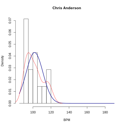 The following graphs show the frequencies of BPMs grouped into "buckets" of 5 BPM each. The second graph is a probability distribution of the BPMs, with the blue line representing a normal distribution and the red line representing a density distribution.